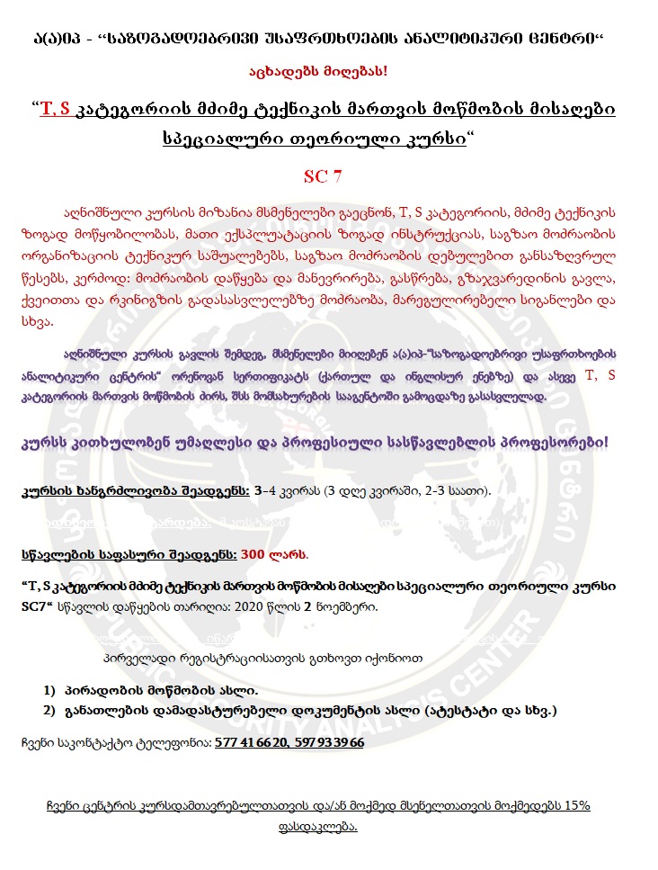 აღნიშნული კურსის მიზანია მსმენელები გაეცნონ, T, S კატეგორიის, მძიმე ტექნიკის ზოგად მოწყობილობას, მათი ექსპლუატაციის ზოგად ინსტრუქციას, საგზაო მოძრაობის ორგანიზაციის ტექნიკურ საშუალებებს, საგზაო მოძრაობის დებულებით განსაზღვრულ წესებს, კერძოდ: მოძრაობის დაწყება და მანევრირება, გასწრება, გზაჯვარედინის გავლა, ქვეითთა და რკინიგზის გადასასვლელებზე მოძრაობა, მარეგულირებელი სიგანლები და სხვა.